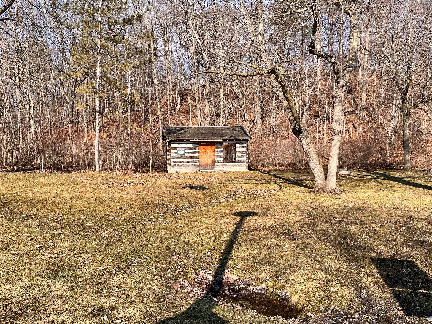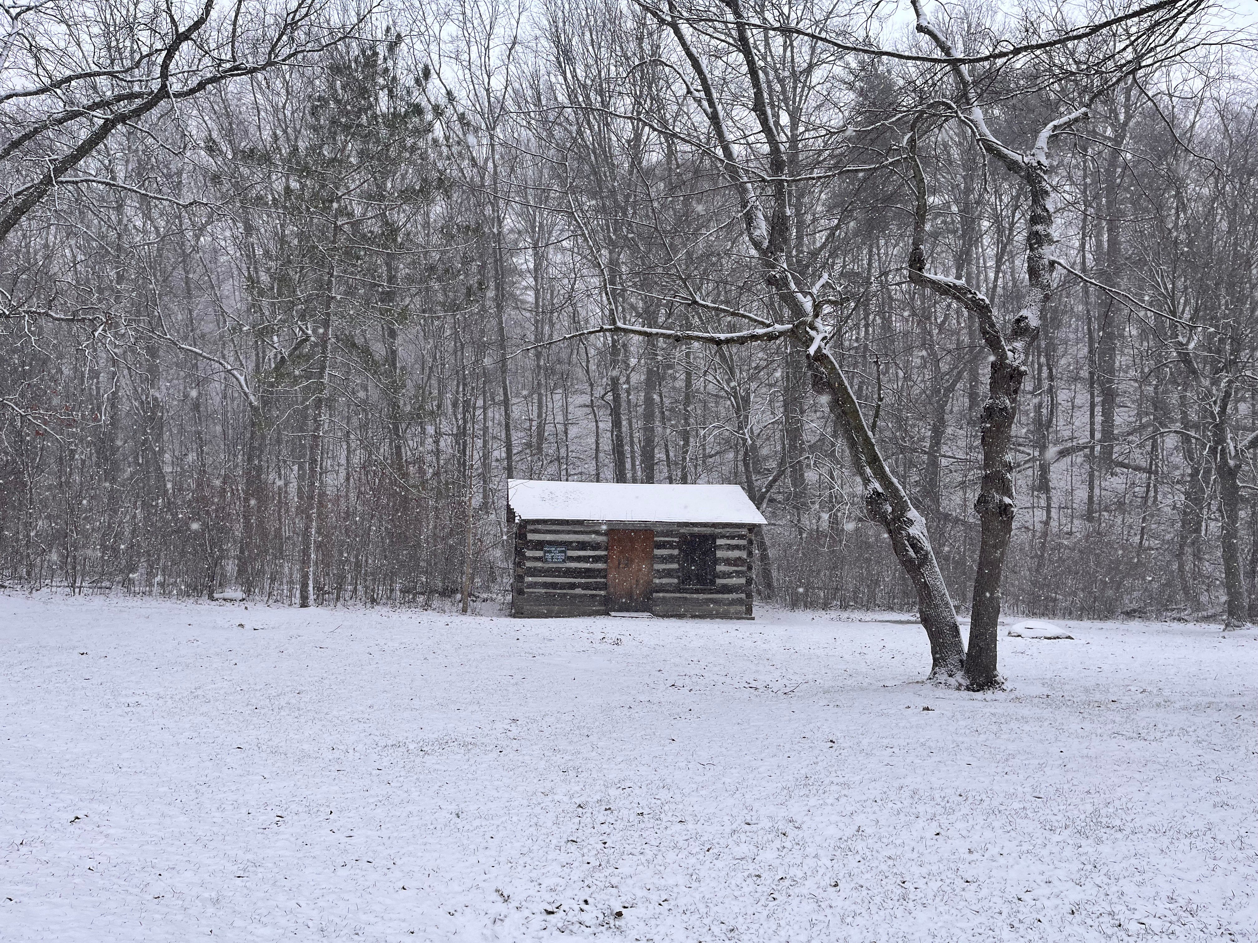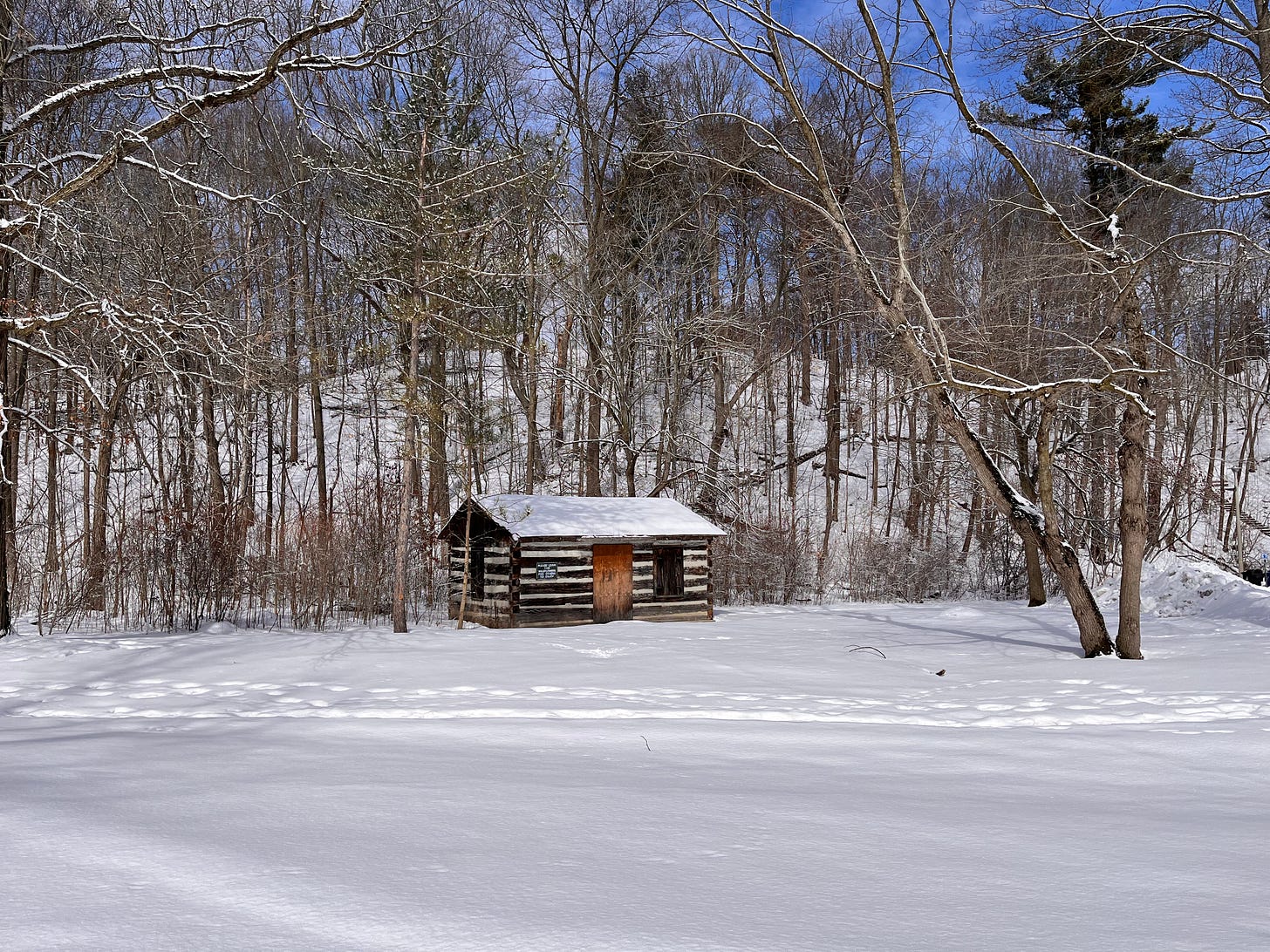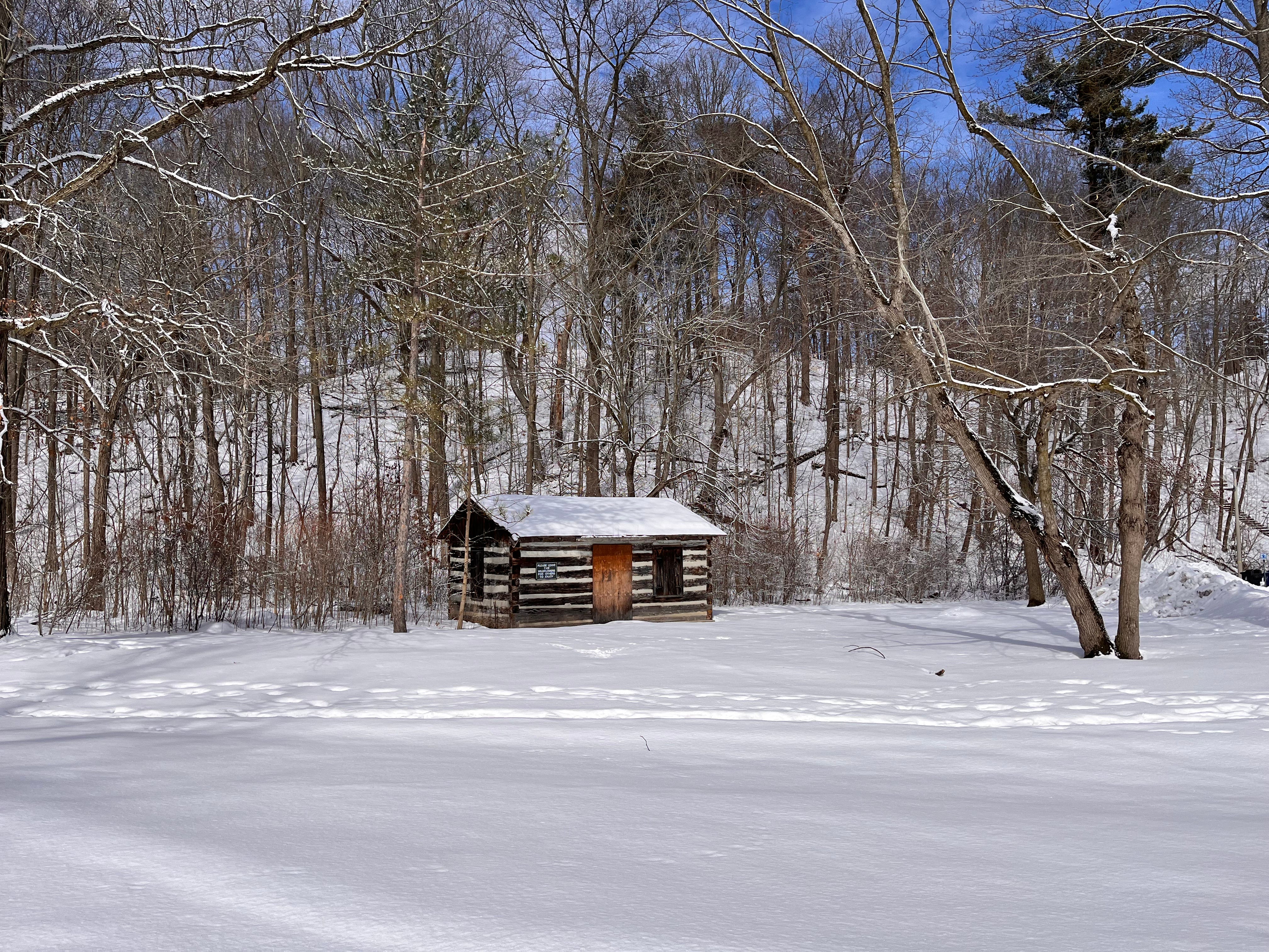 I passed a small log cabin I have noticed many times before. That morning the ground lay deep in snow, the clearing around it a field of white broken only by faint animal tracks. The trees stood bare and silent behind the little structure, their branches dark against the pale winter sky.